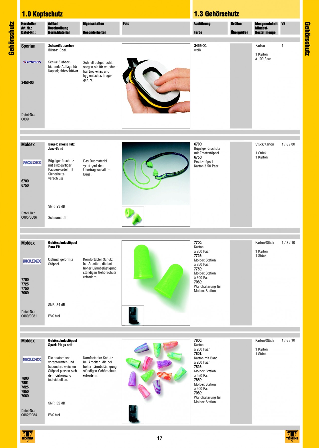 INHALT: 1.0 Kopfschutz Gehörschutz Hersteller Art.Nr.: Datei-Nr.: Artikel Beschreibung Norm/Material Eigenschaften Besonderheiten Foto 1.3 Gehörschutz Gehörschutz Ausführung Farbe Größen Übergrößen Mengeneinheit MindestBestellmenge VE Sperian Schweißabsorber Bilsom Cool 3456-00: weiß Karton 1 Karton à 100 Paar 1 Schweiß absorbierende Auflage für Kapselgehörschützer. 3456-00 Schnell aufgebracht, sorgen sie für wunderbar trockenes und hygienisches Tragegefühl. Datei-Nr.: 0039 Moldex Bügelgehörschutz Jazz-Band 6700 6750 Bügelgehörschutz mit einzigartiger Pausenkordel mit Sicherheitsverschluss. Das Duomaterial verringert den Übertragsschall im Bügel. 6700: Bügelgehörschutz mit Ersatzstöpsel 6750: Ersatzstöpsel Karton à 50 Paar Stück/Karton 1 Stück 1 Karton 1 / 8 / 80 SNR: 23 dB Datei-Nr.: 0085/0086 Schaumstoff Moldex Gehörschutzstöpsel Pura Fit Optimal geformte Stöpsel. 7700 7725 7750 7060 Komfortabler Schutz bei Arbeiten, die bei hoher Lärmbelästigung ständigen Gehörschutz erfordern. 7700: Karton à 200 Paar 7725: Moldex Station à 250 Paar 7750: Moldex Station à 500 Paar 7060: Wandhalterung für Moldex Station Karton/Stück 1 Karton 1 Stück 1 / 8 / 10 SNR: 34 dB Datei-Nr.: 0080/0081 PVC frei Moldex Gehörschutzstöpsel Spark Plugs soft 7800 7801 7825 7850 7060 Die anatomisch vorgeformten und besonders weichen Stöpsel passen sich dem Gehörgang individuell an. Komfortabler Schutz bei Arbeiten, die bei hoher Lärmbelästigung ständigen Gehörschutz erfordern. SNR: 32 dB Datei-Nr.: 0082/0084 PVC frei 7800: Karton à 200 Paar 7801: Karton mit Band à 200 Paar 7825: Moldex Station à 250 Paar 7850: Moldex Station à 500 Paar 7060: Wandhalterung für Moldex Station Karton/Stück 1 Karton 1 Stück 1 / 8 / 10 17