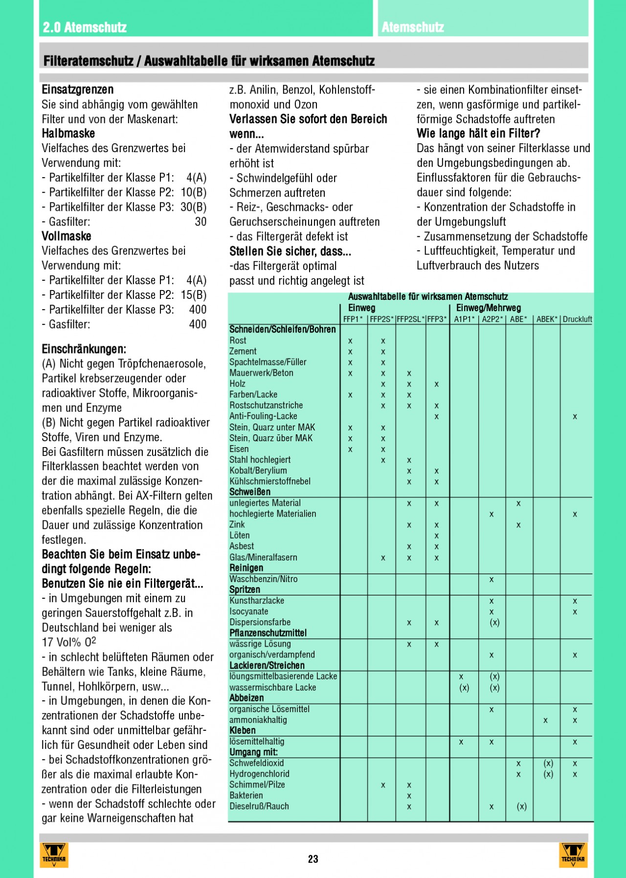 INHALT: 2.0 Atemschutz Filteratemschutz / Auswahltabelle für wirksamen Atemschutz Einsatzgrenzen Sie sind abhängig vom gewählten Filter und von der Maskenart: Halbmaske Vielfaches des Grenzwertes bei Verwendung mit: - Partikelfilter der Klasse P1: 4(A) - Partikelfilter der Klasse P2: 10(B) - Partikelfilter der Klasse P3: 30(B) - Gasfilter: 30 Vollmaske Vielfaches des Grenzwertes bei Verwendung mit: - Partikelfilter der Klasse P1: 4(A) - Partikelfilter der Klasse P2: 15(B) - Partikelfilter der Klasse P3: 400 - Gasfilter: 400 Einschränkungen: (A) Nicht gegen Tröpfchenaerosole, Partikel krebserzeugender oder radioaktiver Stoffe, Mikroorganismen und Enzyme (B) Nicht gegen Partikel radioaktiver Stoffe, Viren und Enzyme. Bei Gasfiltern müssen zusätzlich die Filterklassen beachtet werden von der die maximal zulässige Konzentration abhängt. Bei AX-Filtern gelten ebenfalls spezielle Regeln, die die Dauer und zulässige Konzentration festlegen. Beachten Sie beim Einsatz unbedingt folgende Regeln: Benutzen Sie nie ein Filtergerät... - in Umgebungen mit einem zu geringen Sauerstoffgehalt z.B. in Deutschland bei weniger als 17 Vol% O2 - in schlecht belüfteten Räumen oder Behältern wie Tanks, kleine Räume, Tunnel, Hohlkörpern, usw... - in Umgebungen, in denen die Konzentrationen der Schadstoffe unbekannt sind oder unmittelbar gefährlich für Gesundheit oder Leben sind - bei Schadstoffkonzentrationen größer als die maximal erlaubte Konzentration oder die Filterleistungen - wenn der Schadstoff schlechte oder gar keine Warneigenschaften hat Atemschutz z.B. Anilin, Benzol, Kohlenstoffmonoxid und Ozon Verlassen Sie sofort den Bereich wenn... - der Atemwiderstand spürbar erhöht ist - Schwindelgefühl oder Schmerzen auftreten - Reiz-, Geschmacks- oder Geruchserscheinungen auftreten - das Filtergerät defekt ist Stellen Sie sicher, dass... -das Filtergerät optimal passt und richtig angelegt ist - sie einen Kombinationfilter einsetzen, wenn gasförmige und partikelförmige Schadstoffe auftreten Wie lange hält ein Filter? Das hängt von seiner Filterklasse und den Umgebungsbedingungen ab. Einflussfaktoren für die Gebrauchsdauer sind folgende: - Konzentration der Schadstoffe in der Umgebungsluft - Zusammensetzung der Schadstoffe - Luftfeuchtigkeit, Temperatur und Luftverbrauch des Nutzers Auswahltabelle für wirksamen Atemschutz Einweg Einweg/Mehrweg FFP1* FFP2S* FFP2SL* FFP3* A1P1* A2P2* ABE* ABEK* Druckluft Schneiden/Schleifen/Bohren Rost Zement Spachtelmasse/Füller Mauerwerk/Beton Holz Farben/Lacke Rostschutzanstriche Anti-Fouling-Lacke Stein, Quarz unter MAK Stein, Quarz über MAK Eisen Stahl hochlegiert Kobalt/Berylium Kühlschmierstoffnebel Schweißen unlegiertes Material hochlegierte Materialien Zink Löten Asbest Glas/Mineralfasern Reinigen Waschbenzin/Nitro Spritzen Kunstharzlacke Isocyanate Dispersionsfarbe Pflanzenschutzmittel wässrige Lösung organisch/verdampfend Lackieren/Streichen löungsmittelbasierende Lacke wassermischbare Lacke Abbeizen organische Lösemittel ammoniakhaltig Kleben lösemittelhaltig Umgang mit: Schwefeldioxid Hydrogenchlorid Schimmel/Pilze Bakterien Dieselruß/Rauch x x x x x x x x x x x x x x x x x x x x x x x x x x x x x x x x x x x x x x x x x x x x x (x) x x x x x x x x x x x x (x) (x) (x) x x x x x x x x x x (x) (x) x x x x x x x (x) 23