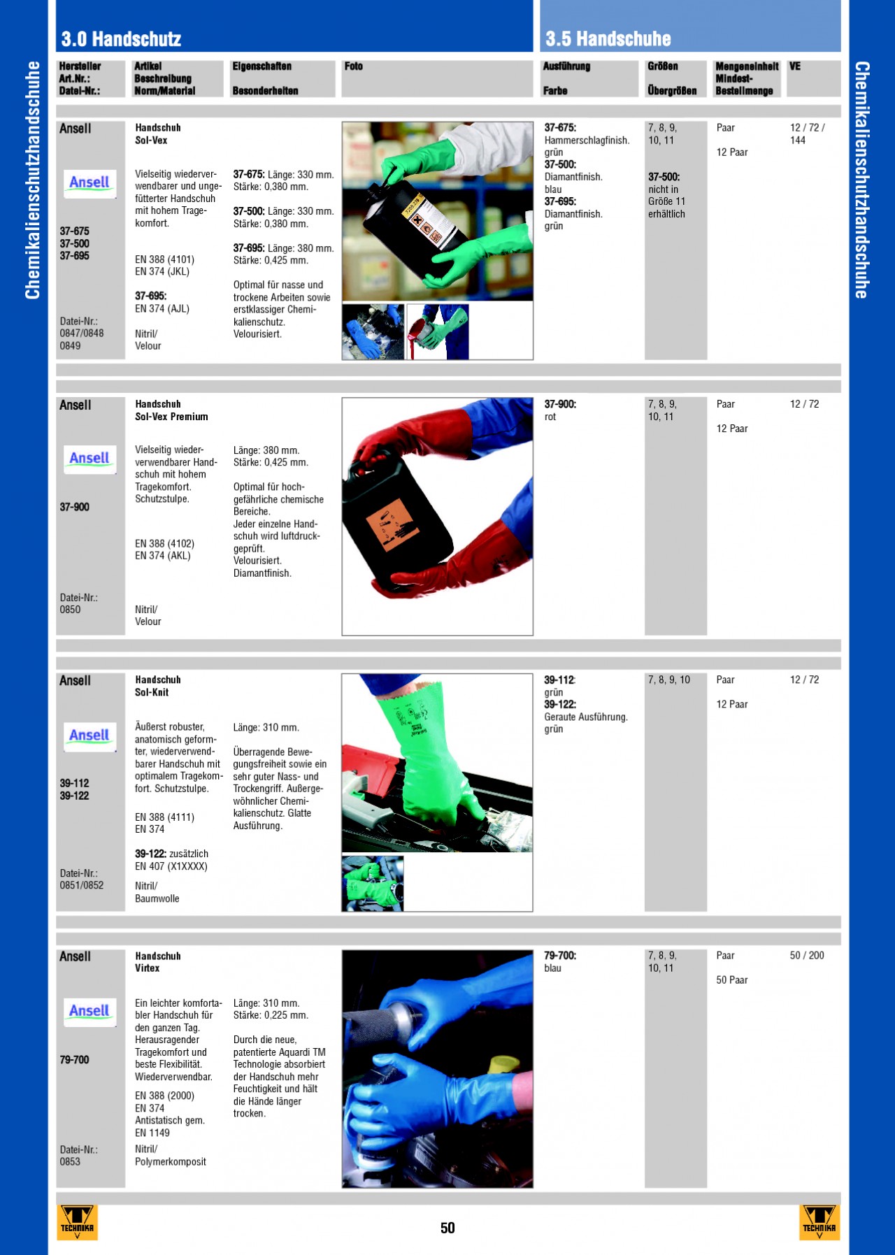 INHALT: 3.0 Handschutz Chemikalienschutzhandschuhe Hersteller Art.Nr.: Datei-Nr.: Artikel Beschreibung Norm/Material Eigenschaften Besonderheiten Foto 3.5 Handschuhe Chemikalienschutzhandschuhe Ausführung Farbe Größen Übergrößen Mengeneinheit MindestBestellmenge VE Ansell Handschuh Sol-Vex Vielseitig wiederverwendbarer und ungefütterter Handschuh mit hohem Tragekomfort. 37-675 37-500 37-695 37-675: Länge: 330 mm. Stärke: 0,380 mm. 37-500: Länge: 330 mm. Stärke: 0,380 mm. 37-695: Länge: 380 mm. Stärke: 0,425 mm. Optimal für nasse und trockene Arbeiten sowie erstklassiger Chemikalienschutz. Velourisiert. 37-675: Hammerschlagfinish. grün 37-500: Diamantfinish. blau 37-695: Diamantfinish. grün 7, 8, 9, 10, 11 Paar 12 Paar 12 / 72 / 144 37-500: nicht in Größe 11 erhältlich EN 388 (4101) EN 374 (JKL) 37-695: EN 374 (AJL) Datei-Nr.: 0847/0848 0849 Nitril/ Velour Ansell Handschuh Sol-Vex Premium 37-900: rot 7, 8, 9, 10, 11 Paar 12 Paar 12 / 72 Vielseitig wiederverwendbarer Handschuh mit hohem Tragekomfort. Schutzstulpe. 37-900 Länge: 380 mm. Stärke: 0,425 mm. Optimal für hochgefährliche chemische Bereiche. Jeder einzelne Handschuh wird luftdruckgeprüft. Velourisiert. Diamantfinish. EN 388 (4102) EN 374 (AKL) Datei-Nr.: 0850 Nitril/ Velour Ansell Handschuh Sol-Knit 39-112 39-122 Äußerst robuster, anatomisch geformter, wiederverwendbarer Handschuh mit optimalem Tragekomfort. Schutzstulpe. EN 388 (4111) EN 374 39-122: zusätzlich EN 407 (X1XXXX) Nitril/ Baumwolle Länge: 310 mm. Überragende Bewegungsfreiheit sowie ein sehr guter Nass- und Trockengriff. Außergewöhnlicher Chemikalienschutz. Glatte Ausführung. 39-112: grün 39-122: Geraute Ausführung. grün 7, 8, 9, 10 Paar 12 Paar 12 / 72 Datei-Nr.: 0851/0852 Ansell Handschuh Virtex 79-700: blau 7, 8, 9, 10, 11 Paar 50 Paar 50 / 200 79-700 Ein leichter komfortabler Handschuh für den ganzen Tag. Herausragender Tragekomfort und beste Flexibilität. Wiederverwendbar. EN 388 (2000) EN 374 Antistatisch gem. EN 1149 Länge: 310 mm. Stärke: 0,225 mm. Durch die neue, patentierte Aquardi TM Technologie absorbiert der Handschuh mehr Feuchtigkeit und hält die Hände länger trocken. Datei-Nr.: 0853 Nitril/ Polymerkomposit 50