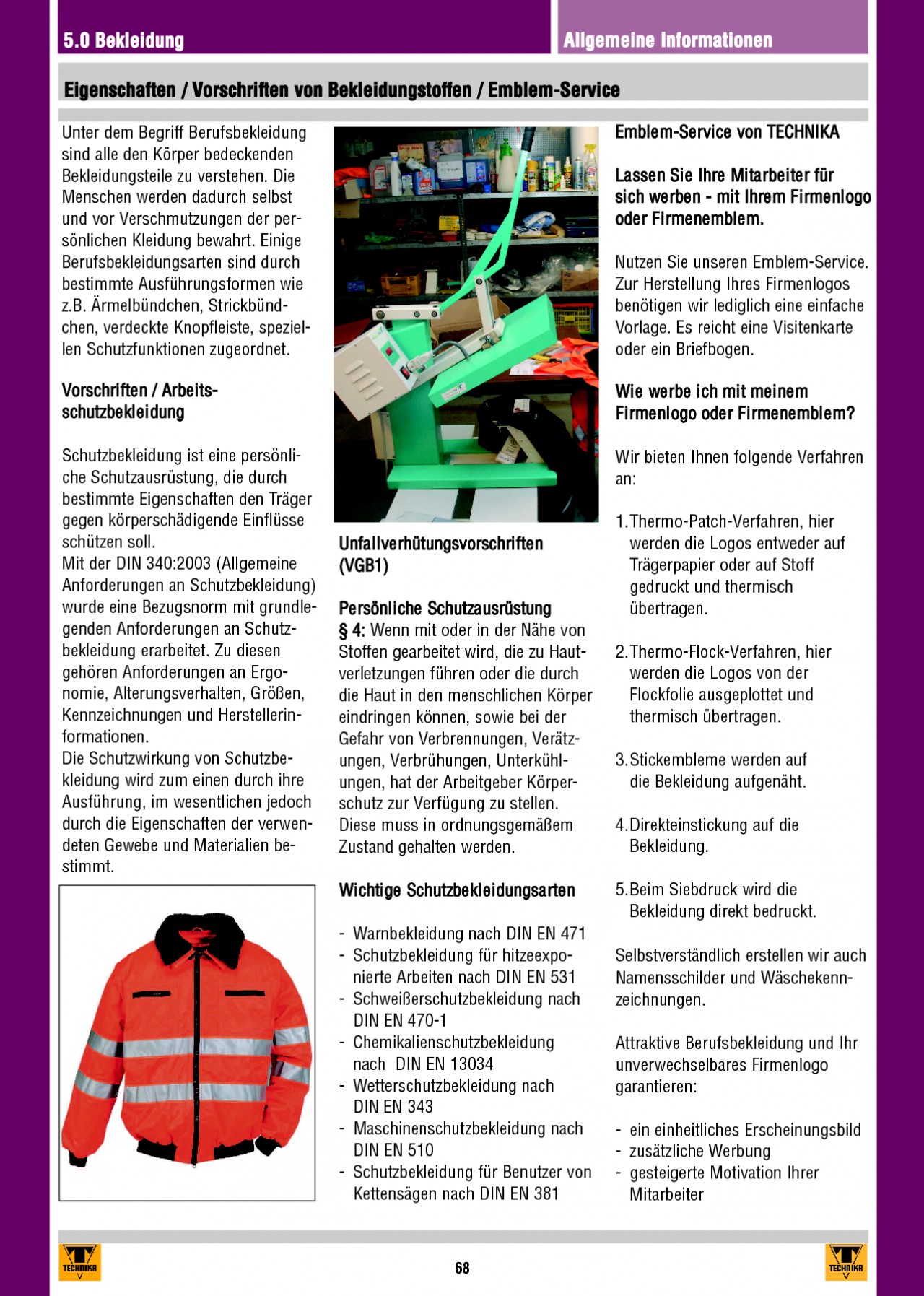 INHALT: 5.0 Bekleidung Allgemeine Informationen Eigenschaften / Vorschriften von Bekleidungstoffen / Emblem-Service Unter dem Begriff Berufsbekleidung sind alle den Körper bedeckenden Bekleidungsteile zu verstehen. Die Menschen werden dadurch selbst und vor Verschmutzungen der persönlichen Kleidung bewahrt. Einige Berufsbekleidungsarten sind durch bestimmte Ausführungsformen wie z.B. Ärmelbündchen, Strickbündchen, verdeckte Knopfleiste, speziellen Schutzfunktionen zugeordnet. Vorschriften / Arbeitsschutzbekleidung Schutzbekleidung ist eine persönliche Schutzausrüstung, die durch bestimmte Eigenschaften den Träger gegen körperschädigende Einflüsse schützen soll. Mit der DIN 340:2003 (Allgemeine Anforderungen an Schutzbekleidung) wurde eine Bezugsnorm mit grundlegenden Anforderungen an Schutzbekleidung erarbeitet. Zu diesen gehören Anforderungen an Ergonomie, Alterungsverhalten, Größen, Kennzeichnungen und Herstellerinformationen. Die Schutzwirkung von Schutzbekleidung wird zum einen durch ihre Ausführung, im wesentlichen jedoch durch die Eigenschaften der verwendeten Gewebe und Materialien bestimmt. Emblem-Service von TECHNIKA Lassen Sie Ihre Mitarbeiter für sich werben - mit Ihrem Firmenlogo oder Firmenemblem. Nutzen Sie unseren Emblem-Service. Zur Herstellung Ihres Firmenlogos benötigen wir lediglich eine einfache Vorlage. Es reicht eine Visitenkarte oder ein Briefbogen. Wie werbe ich mit meinem Firmenlogo oder Firmenemblem? Wir bieten Ihnen folgende Verfahren an: 1.Thermo-Patch-Verfahren, hier werden die Logos entweder auf Trägerpapier oder auf Stoff gedruckt und thermisch übertragen. 2.Thermo-Flock-Verfahren, hier werden die Logos von der Flockfolie ausgeplottet und thermisch übertragen. 3.Stickembleme werden auf die Bekleidung aufgenäht. 4.Direkteinstickung auf die Bekleidung. 5.Beim Siebdruck wird die Bekleidung direkt bedruckt. Selbstverständlich erstellen wir auch Namensschilder und Wäschekennzeichnungen. Attraktive Berufsbekleidung und Ihr unverwechselbares Firmenlogo garantieren: - ein einheitliches Erscheinungsbild - zusätzliche Werbung - gesteigerte Motivation Ihrer Mitarbeiter Unfallverhütungsvorschriften (VGB1) Persönliche Schutzausrüstung § 4: Wenn mit oder in der Nähe von Stoffen gearbeitet wird, die zu Hautverletzungen führen oder die durch die Haut in den menschlichen Körper eindringen können, sowie bei der Gefahr von Verbrennungen, Verätzungen, Verbrühungen, Unterkühlungen, hat der Arbeitgeber Körperschutz zur Verfügung zu stellen. Diese muss in ordnungsgemäßem Zustand gehalten werden. Wichtige Schutzbekleidungsarten - Warnbekleidung nach DIN EN 471 - Schutzbekleidung für hitzeexponierte Arbeiten nach DIN EN 531 - Schweißerschutzbekleidung nach DIN EN 470-1 - Chemikalienschutzbekleidung nach DIN EN 13034 - Wetterschutzbekleidung nach DIN EN 343 - Maschinenschutzbekleidung nach DIN EN 510 - Schutzbekleidung für Benutzer von Kettensägen nach DIN EN 381 68