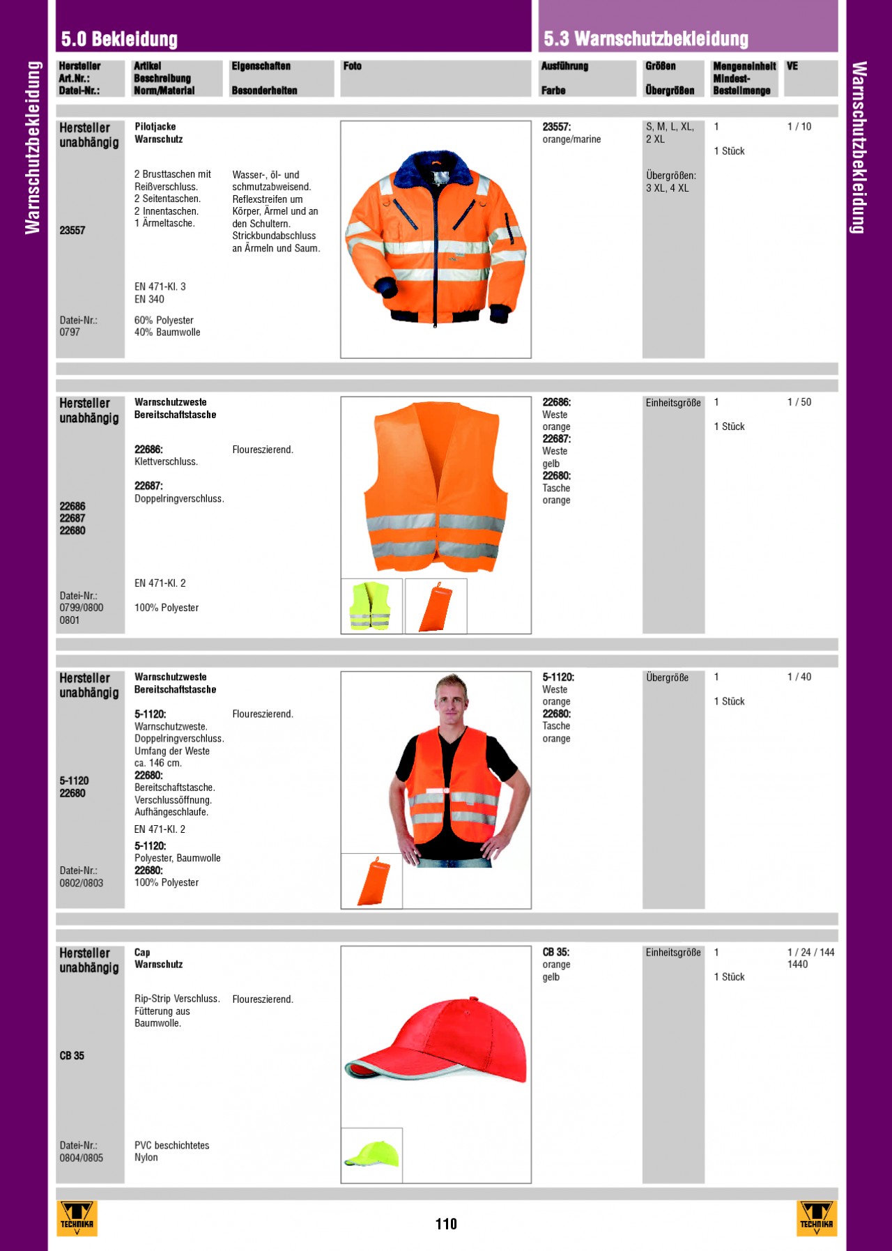 INHALT: 5.0 Bekleidung Warnschutzbekleidung Hersteller Art.Nr.: Datei-Nr.: Artikel Beschreibung Norm/Material Eigenschaften Besonderheiten Foto 5.3 Warnschutzbekleidung Warnschutzbekleidung Ausführung Farbe Größen Übergrößen Mengeneinheit MindestBestellmenge VE Hersteller unabhängig Pilotjacke Warnschutz 23557: orange/marine S, M, L, XL, 2 XL 1 1 Stück 1 / 10 23557 2 Brusttaschen mit Reißverschluss. 2 Seitentaschen. 2 Innentaschen. 1 Ärmeltasche. Wasser-, öl- und schmutzabweisend. Reflexstreifen um Körper, Ärmel und an den Schultern. Strickbundabschluss an Ärmeln und Saum. Übergrößen: 3 XL, 4 XL EN 471-Kl. 3 EN 340 Datei-Nr.: 0797 60% Polyester 40% Baumwolle Hersteller unabhängig Warnschutzweste Bereitschaftstasche 22686: Klettverschluss. 22687: Doppelringverschluss. 22686 22687 22680 Floureszierend. 22686: Weste orange 22687: Weste gelb 22680: Tasche orange Einheitsgröße 1 1 Stück 1 / 50 EN 471-Kl. 2 Datei-Nr.: 0799/0800 0801 100% Polyester Hersteller unabhängig Warnschutzweste Bereitschaftstasche Floureszierend. 5-1120: Warnschutzweste. Doppelringverschluss. Umfang der Weste ca. 146 cm. 22680: Bereitschaftstasche. Verschlussöffnung. Aufhängeschlaufe. EN 471-Kl. 2 5-1120: Polyester, Baumwolle 22680: 100% Polyester 5-1120: Weste orange 22680: Tasche orange Übergröße 1 1 Stück 1 / 40 5-1120 22680 Datei-Nr.: 0802/0803 Hersteller unabhängig Cap Warnschutz CB 35: orange gelb Floureszierend. Einheitsgröße 1 1 Stück 1 / 24 / 144 1440 Rip-Strip Verschluss. Fütterung aus Baumwolle. CB 35 Datei-Nr.: 0804/0805 PVC beschichtetes Nylon 110