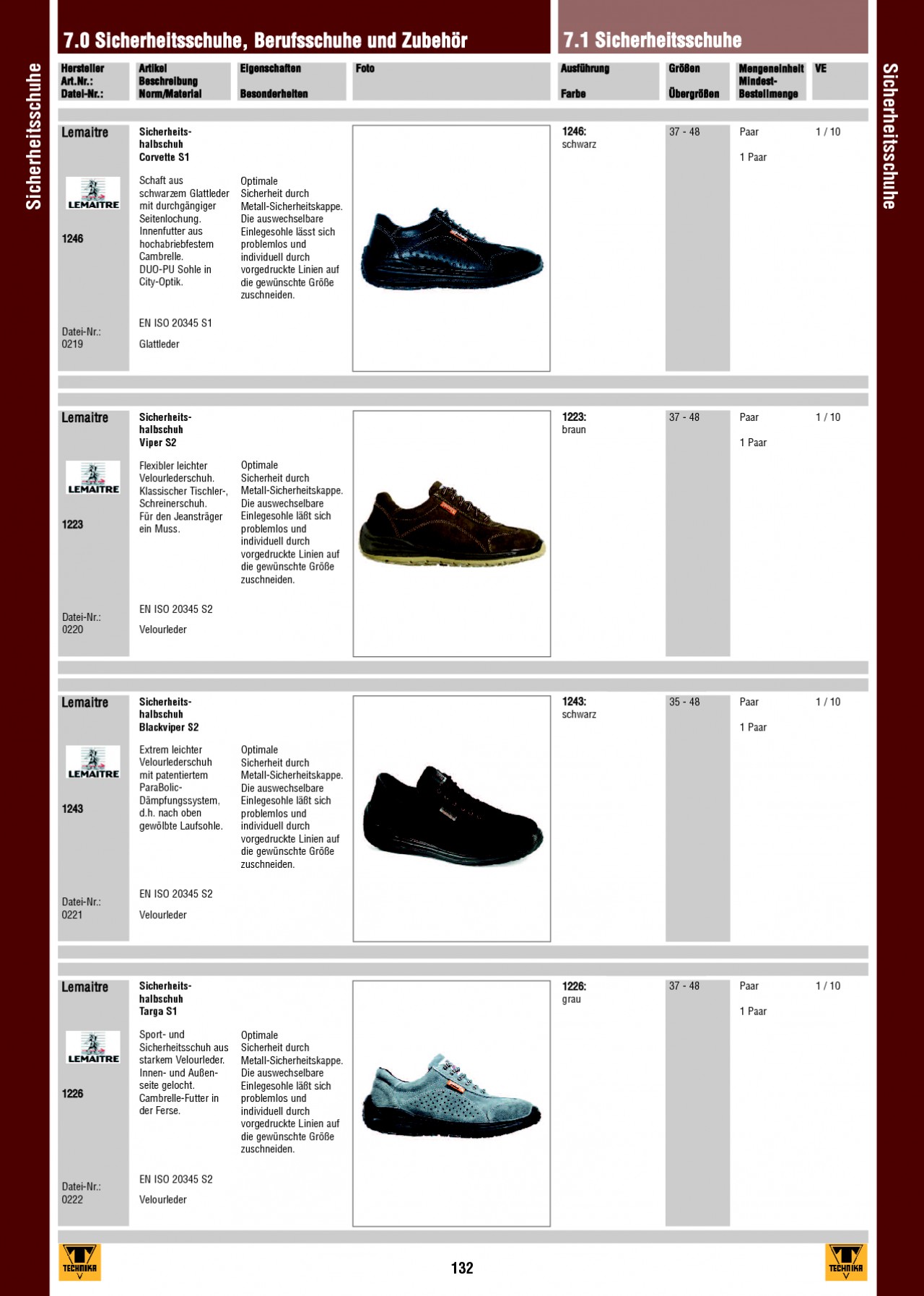 INHALT: 7.0 Sicherheitsschuhe, Berufsschuhe und Zubehör Sicherheitsschuhe Hersteller Art.Nr.: Datei-Nr.: Artikel Beschreibung Norm/Material Eigenschaften Besonderheiten Foto 7.1 Sicherheitsschuhe Sicherheitsschuhe Ausführung Farbe Größen Übergrößen Mengeneinheit MindestBestellmenge VE Lemaitre Sicherheitshalbschuh Corvette S1 Schaft aus schwarzem Glattleder mit durchgängiger Seitenlochung. Innenfutter aus hochabriebfestem Cambrelle. DUO-PU Sohle in City-Optik. Optimale Sicherheit durch Metall-Sicherheitskappe. Die auswechselbare Einlegesohle lässt sich problemlos und individuell durch vorgedruckte Linien auf die gewünschte Größe zuschneiden. 1246: schwarz 37 - 48 Paar 1 Paar 1 / 10 1246 EN ISO 20345 S1 Datei-Nr.: 0219 Glattleder Lemaitre Sicherheitshalbschuh Viper S2 Flexibler leichter Velourlederschuh. Klassischer Tischler-, Schreinerschuh. Für den Jeansträger ein Muss. Optimale Sicherheit durch Metall-Sicherheitskappe. Die auswechselbare Einlegesohle läßt sich problemlos und individuell durch vorgedruckte Linien auf die gewünschte Größe zuschneiden. 1223: braun 37 - 48 Paar 1 Paar 1 / 10 1223 Datei-Nr.: 0220 EN ISO 20345 S2 Velourleder Lemaitre Sicherheitshalbschuh Blackviper S2 Extrem leichter Velourlederschuh mit patentiertem ParaBolicDämpfungssystem, d.h. nach oben gewölbte Laufsohle. Optimale Sicherheit durch Metall-Sicherheitskappe. Die auswechselbare Einlegesohle läßt sich problemlos und individuell durch vorgedruckte Linien auf die gewünschte Größe zuschneiden. 1243: schwarz 35 - 48 Paar 1 Paar 1 / 10 1243 EN ISO 20345 S2 Datei-Nr.: 0221 Velourleder Lemaitre Sicherheitshalbschuh Targa S1 Sport- und Sicherheitsschuh aus starkem Velourleder. Innen- und Außenseite gelocht. Cambrelle-Futter in der Ferse. Optimale Sicherheit durch Metall-Sicherheitskappe. Die auswechselbare Einlegesohle läßt sich problemlos und individuell durch vorgedruckte Linien auf die gewünschte Größe zuschneiden. 1226: grau 37 - 48 Paar 1 Paar 1 / 10 1226 Datei-Nr.: 0222 EN ISO 20345 S2 Velourleder 132