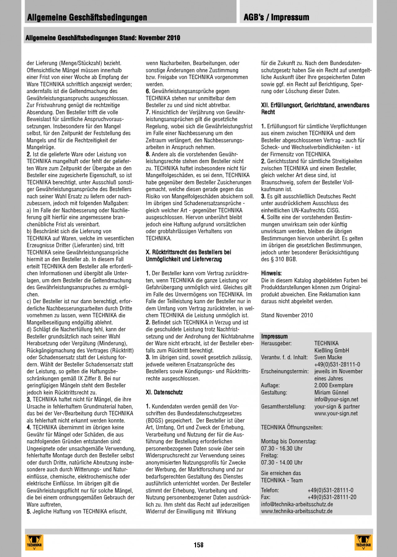 INHALT: Allgemeine Geschäftsbedingungen Allgemeine Geschäftsbedingungen Stand: November 2010 AGB's / Impressum der Lieferung (Menge/Stückzahl) bezieht. Offensichtliche Mängel müssen innerhalb einer Frist von einer Woche ab Empfang der Ware TECHNIKA schriftlich angezeigt werden; andernfalls ist die Geltendmachung des Gewährleistungsanspruchs ausgeschlossen. Zur Fristwahrung genügt die rechtzeitige Absendung. Den Besteller trifft die volle Beweislast für sämtliche Anspruchvoraussetzungen. Insbesondere für den Mangel selbst, für den Zeitpunkt der Feststellung des Mangels und für die Rechtzeitigkeit der Mangelrüge. 2. Ist die gelieferte Ware oder Leistung von TECHNIKA mangelhaft oder fehlt der gelieferten Ware zum Zeitpunkt der Übergabe an den Besteller eine zugesicherte Eigenschaft, so ist TECHNIKA berechtigt, unter Ausschluß sonstiger Gewährleistungsansprüche des Bestellers nach seiner Wahl Ersatz zu liefern oder nachzubessern, jedoch mit folgenden Maßgaben: a) Im Falle der Nachbesserung oder Nachlieferung gilt hierfür eine angemessene branchenübliche Frist als vereinbart. b) Beschränkt sich die Lieferung von TECHNIKA auf Waren, welche im wesentlichen Erzeugnisse Dritter (Lieferanten) sind, tritt TECHNIKA seine Gewährleistungsansprüche hiermit an den Besteller ab. In diesem Fall erteilt TECHNIKA dem Besteller alle erforderlichen Informationen und übergibt alle Unterlagen, um dem Besteller die Geltendmachung des Gewährleistungsanspruches zu ermöglichen. c) Der Besteller ist nur dann berechtigt, erforderliche Nachbesserungsarbeiten durch Dritte vornehmen zu lassen, wenn TECHNIKA die Mangelbeseitigung endgültig ablehnt. d) Schlägt die Nacherfüllung fehl, kann der Besteller grundsätzlich nach seiner Wahl Herabsetzung oder Vergütung (Minderung), Rückgängigmachung des Vertrages (Rücktritt) oder Schadensersatz statt der Leistung fordern. Wählt der Besteller Schadensersatz statt der Leistung, so gelten die Haftungsbeschränkungen gemäß IX Ziffer 8. Bei nur geringfügigen Mängeln steht dem Besteller jedoch kein Rücktrittsrecht zu. 3. TECHNIKA haftet nicht für Mängel, die ihre Ursache in fehlerhaftem Grundmaterial haben, das bei der Ver-/Bearbeitung durch TECHNIKA als fehlerhaft nicht erkannt werden konnte. 4. TECHNIKA übernimmt im übrigen keine Gewähr für Mängel oder Schäden, die aus nachfolgenden Gründen entstanden sind: Ungeeignete oder unsachgemäße Verwendung, fehlerhafte Montage durch den Besteller selbst oder durch Dritte, natürliche Abnutzung insbesondere auch durch Witterungs- und Natureinflüsse, chemische, elektrochemische oder elektrische Einflüsse. Im übrigen gilt die Gewährleistungspflicht nur für solche Mängel, die bei einem ordnungsgemäßen Gebrauch der Ware auftreten, 5. Jegliche Haftung von TECHNIKA erlischt, wenn Nacharbeiten, Bearbeitungen, oder sonstige Änderungen ohne Zustimmung bzw. Freigabe von TECHNIKA vorgenommen werden. 6. Gewährleistungsansprüche gegen TECHNIKA stehen nur unmittelbar dem Besteller zu und sind nicht abtretbar. 7. Hinsichtlich der Verjährung von Gewährleistungsansprüchen gilt die gesetzliche Regelung, wobei sich die Gewährleistungsfrist im Falle einer Nachbesserung um den Zeitraum verlängert, den Nachbesserungsarbeiten in Anspruch nehmen. 8. Andere als die vorstehenden Gewährleistungsrechte stehen dem Besteller nicht zu. TECHNIKA haftet insbesondere nicht für Mangelfolgeschäden, es sei denn, TECHNIKA habe gegenüber dem Besteller Zusicherungen gemacht, welche diesen gerade gegen das Risiko von Mangelfolgeschäden absichern soll. Im übrigen sind Schadenersatzansprüche gleich welcher Art - gegenüber TECHNIKA ausgeschlossen. Hiervon unberührt bleibt jedoch eine Haftung aufgrund vorsätzlichen oder grobfahrlässigen Verhaltens von TECHNIKA. X. Rücktrittsrecht des Bestellers bei Unmöglichkeit und Lieferverzug 1. Der Besteller kann vom Vertrag zurücktreten, wenn TECHNIKA die ganze Leistung vor Gefahrübergang unmöglich wird. Gleiches gilt im Falle des Unvermögens von TECHNIKA. Im Falle der Teilleistung kann der Besteller nur in dem Umfang vom Vertrag zurücktreten, in welchem TECHNIKA die Leistung unmöglich ist. 2. Befindet sich TECHNIKA in Verzug und ist die geschuldete Leistung trotz Nachfristsetzung und der Androhung der Nichtabnahme der Ware nicht erbracht, ist der Besteller ebenfalls zum Rücktritt berechtigt. 3. Im übrigen sind, soweit gesetzlich zulässig, jedwede weiteren Ersatzansprüche des Bestellers sowie Kündigungs- und Rücktrittsrechte ausgeschlossen. XI. Datenschutz 1. Kundendaten werden gemäß den Vorschriften des Bundesdatenschutzgesetzes (BDGS) gespeichert. Der Besteller ist über Art, Umfang, Ort und Zweck der Erhebung, Verarbeitung und Nutzung der für die Ausführung der Bestellung erforderlichen personenbezogenen Daten sowie über sein Widerspruchsrecht zur Verwendung seines anonymisierten Nutzungsprofils für Zwecke der Werbung, der Marktforschung und zur bedarfsgerechten Gestaltung des Dienstes ausführlich unterrichtet worden. Der Besteller stimmt der Erhebung, Verarbeitung und Nutzung personenbezogener Daten ausdrücklich zu. Ihm steht das Recht auf jederzeitigen Widerruf der Einwilligung mit Wirkung für die Zukunft zu. Nach dem Bundesdatenschutzgesetz haben Sie ein Recht auf unentgeltliche Auskunft über Ihre gespeicherten Daten sowie ggf. ein Recht auf Berichtigung, Sperrung oder Löschung dieser Daten. XII. Erfüllungsort, Gerichtstand, anwendbares Recht 1. Erfüllungsort für sämtliche Verpflichtungen aus einem zwischen TECHNIKA und dem Besteller abgeschlossenen Vertrag - auch für Scheck- und Wechselverbindlichkeiten - ist der Firmensitz von TECHNIKA. 2. Gerichtsstand für sämtliche Streitigkeiten zwischen TECHNIKA und einem Besteller, gleich welcher Art diese sind, ist Braunschweig, sofern der Besteller Vollkaufmann ist. 3. Es gilt ausschließlich Deutsches Recht unter ausdrücklichem Ausschluss des einheitlichen UN-Kaufrechts CISG. 4. Sollte eine d
